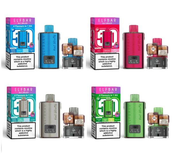 The Elf Bar 4-in-1 Ultra 50 is an innovative prefilled pod kit that brings four flavours together in one sleek, portable device. Forget carrying multiple vapes—simply use the slider to switch flavours instantly. Designed for both performance and convenience, it features a transparent pod design for easy e-liquid monitoring and a 3-level battery display to keep track of power. Powered by advanced QUAQ mesh coil technology, it delivers bold, consistent flavour and dense vapour with every puff. With its simple setup, just insert the refill containers and enjoy a seamless vaping experience.