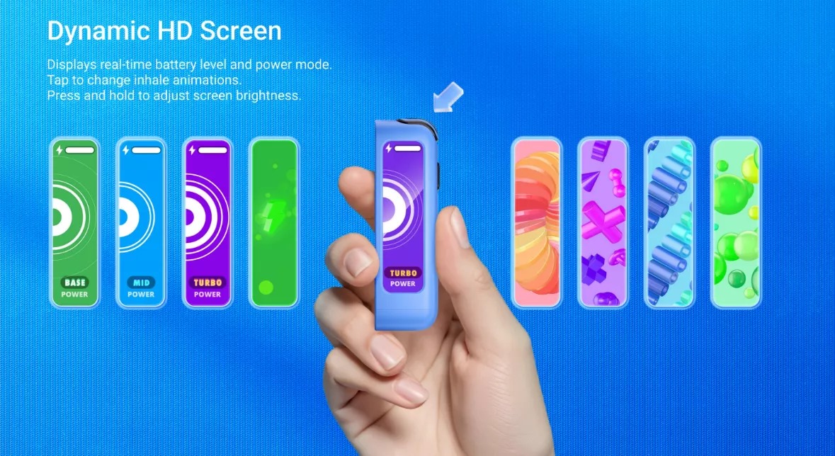 The 2.25” HD colour display delivers clear, intuitive information at a glance — including battery level, puff count, mode selection, and pod status. Tap to switch animations or icons, and press and hold to adjust brightness. The interface feels modern, responsive, and premium, offering smart functionality without unnecessary complexity.
