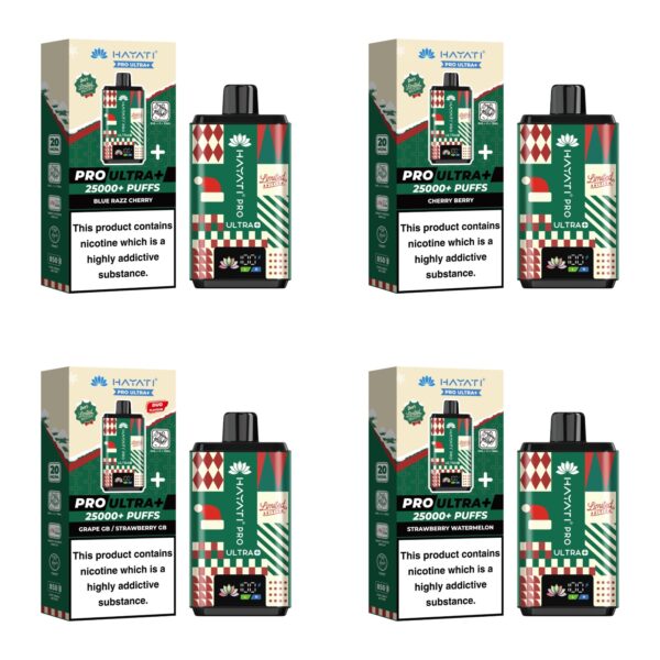 Designed to celebrate the festive season, this Christmas Edition features vibrant red, green, and white detailing, a “2025 Limited Edition” badge, and playful holiday elements such as Santa hats. Powered by an 850mAh pure cobalt battery, it offers reliable, long-lasting performance, pairing modern technology with a fun, collectible seasonal design. The Hayati Pro Ultra+ 25000 is a high-performance, eco-conscious pod kit built for both beginners and seasoned vapers. It includes dual pre-filled e-liquid tanks, a clear window for monitoring levels, and a customisable mouthpiece that lets you switch flavours instantly by rotating it 180 degrees.