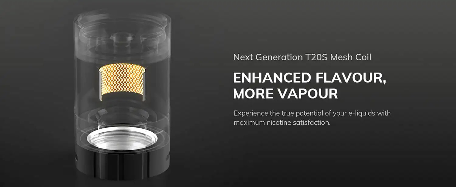 The T20S Mesh coil operates within a power range of 14.5 to 18 watts.