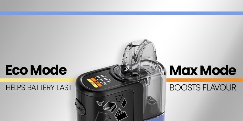 The MVP 60K offers dual vaping modes (Normal and Boost) for a personalised experience. Its sleek, compact design houses a long-lasting 1000mAh rechargeable battery with USB-C fast charging to keep you going with minimal downtime. Swapping flavours is easy with replaceable pods, while the built-in LCD display provides real-time updates on battery life and e-liquid levels. The LCD display keeps you updated on battery levels and lets you effortlessly toggle between energy-saving Eco Mode and flavour-enhancing Max Mode. Each pod contains 20mg nicotine salt and features a 3-in-1 flavour system, delivering both convenience and variety in every session.