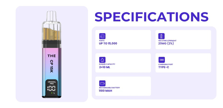 The Crystal Pro CP 15K includes a fully transparent tank, allowing you to instantly check your e-liquid levels. This smart design removes guesswork, helping you avoid dry hits and know exactly when a refill is needed.